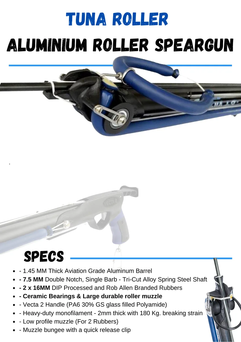 Tuna Roller Gun 1.1m- Ceramic Bearings- Load Assist- 65cm16mm Rubber- 15m7.5mm D/N Spear
